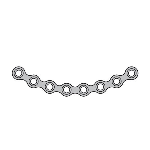 Мини-пластина низкопрофильная толщиной 0,6 мм изготовлена из титана, имеет С-образную форму и 8 отверстий. Применяется для черепно-челюстно-лицевого остеосинтеза и костной пластики.