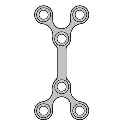 Длинная мини-пластина толщиной 1 мм изготовлена из титана, имеет Х-образную форму и 6 отверстий. Применяется для черепно-челюстно-лицевого остеосинтеза и костной пластики.