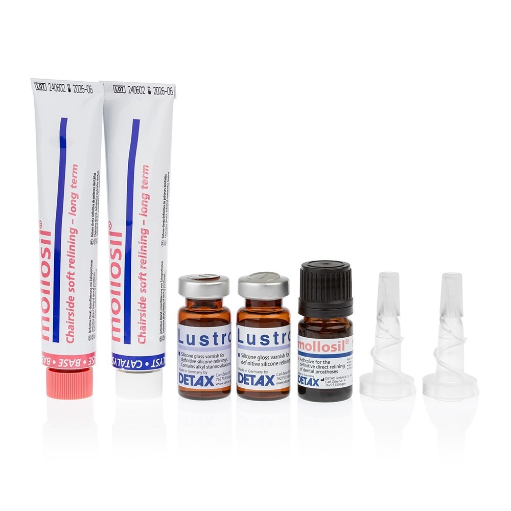 mollosil - долговечный материал для прямой перебазировки протезов на основе А-силикона, мягкопластичный, холодного отверждения. Надежная адгезия на акриловых пласмассах протезов. Для ручного замешивания, дозировка 1:1. Также пригоден для временных немедленных протезов. Биосовместим, антибактериален, обладает нейтральным запахом и вкусом. Может обрабатываться непрямым методом.
