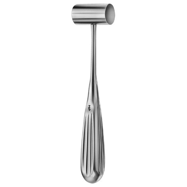 Молоток, диаметр 25 мм, длина 190 мм, 155 г, DF114R, B.Braun (Aesculap, Германия) предназначен для работы с плотной тканью – костной, хрящевой. С его помощью наносятся удары по остеотому для того, чтобы расщепить костную ткань. Инструмент изготовлен из высококачественной нержавеющей стали, имеет две рабочие поверхности диаметром 25 мм, рукоятка плоская, с упором для большого пальца. Для улучшения рабочих свойств молотка масса тела значительно превосходит массу рукоятки.