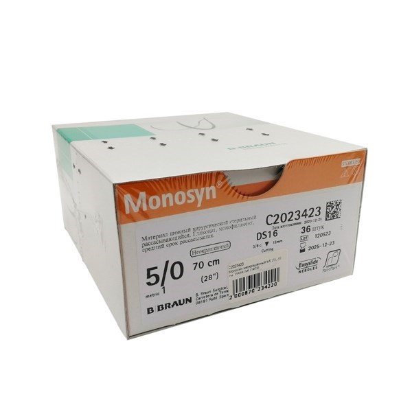 Моносин неокрашенный 5/0 (1), 70 см, DS16 (Bbraun) - синтетическая монофиламентная нить со средним сроком рассасывания на основе гликоната. Нить применяется для закрытия поверхностных ран и имеет неокрашенный цвет. Она позволяет осуществлять надежную поддержку мягких тканей на протяжении всего периода заживления.