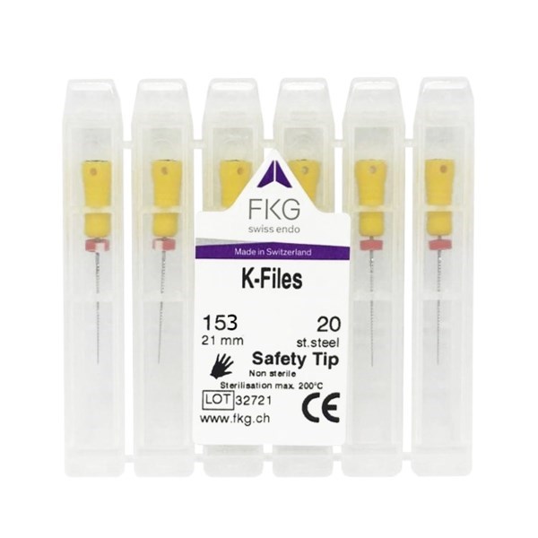 Ручные эндодонтические файлы изготовлены из стали или NiTi стандартных ISO размеров от 6 до 40, имеют неактивный безопасный кончик, который является эксклюзивной разработкой компании FKG, и эргономичную ручку – (SMG). Эргономичную ручку удобнее держать, благодаря увеличенному диаметру. На конце ручки расположен 8-сегментный индикатор кратности использования. После каждого применения на один сегмент наносится засечка, то есть фиксируется информация о количестве циклов использования и стерилизации. Когда все сегменты помечены засечками, инструмент необходимо утилизировать.