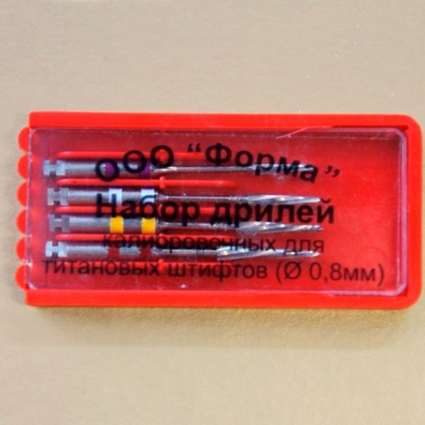 Набор ассорти калибровочных дрилей от российского бренда «Форма» разработан специально для использования титановых штифтов. Разные по форме и размеру вспомогательные инструменты помогают определить диаметр апикального отверстия уже после обработки.
