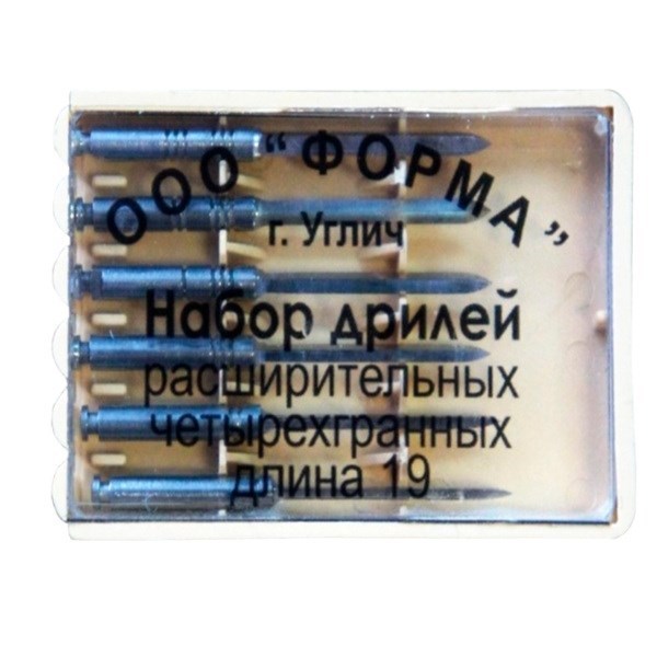 Набор ассорти дрилей расширительных четырёхгранных (для установки стекловолоконных, позолоченных, внутриканальных титановых, нержавеющих штифтов), длина 19,0, уп. 6 шт.