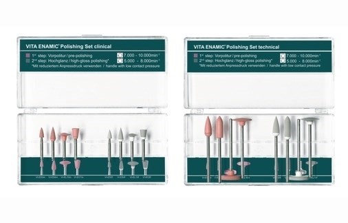 Набор для полировки керамики VITA ENAMIC Polishing Set Technical - набор инструментов для надежной, экономичной и соответствующей материалу обработки поверхности реставраций из гибридной керамики ENAMIC в лаборатории. Включает всего 8 инстурментов для углового наконечника, 4 инструмента для предварительной полировки и 4 инструмента для глянцевой полировки.