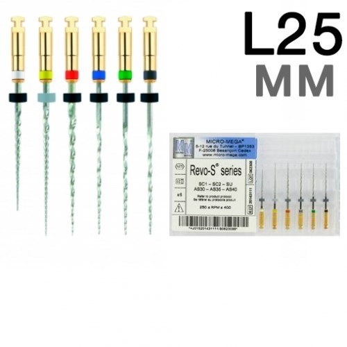 Описание: Набор файлов REVO-S Assortiment: L25 мм, (6 шт.). SC1-SC2-SU-AS30-AS35-AS40 20143111 (NiTi). Micro-MegaREVO-S – система никель-титановых инструментов для первичного эндодонтического лечения.