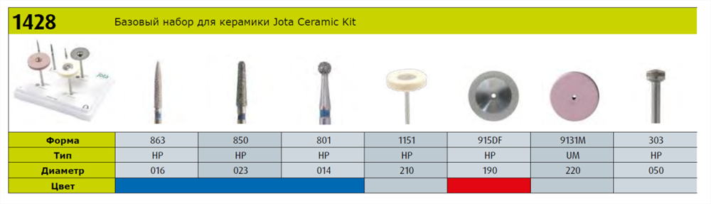 Набор инструментов для керамики Jota Ceramic Kit (7 инструментов) №1428: алмазные боры 863.HP.016, 850.HP.023, 801.HP.014, полиры 1151.HP.210, 9131М.UM.220, диск алмазный 915DF.UM.190, дискодержатель 303.HP.050.