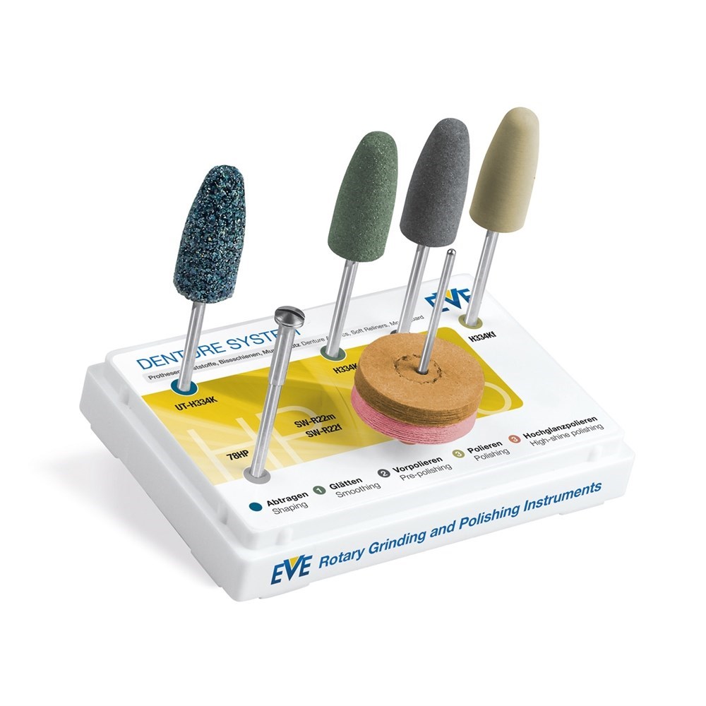 Набор EVE DENTURE SYSTEM HP 125 состоит из силиконовых полиров для протезов из акрила, протезов и ортодонтического акрила.