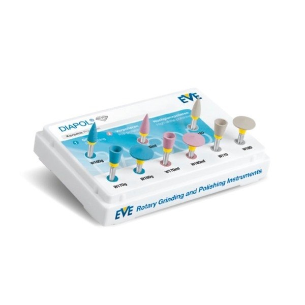 Трёхшаговая система алмазной полировки DIAPOL используется для обработки, сглаживания и полировки до зеркального блеска керамики и металла. Полиры EVE Diapol за счет короткого времени обработки и безупречного результата полировки без пасты высоко ценятся как в качестве коррекционных инструментов для исправления нарушений блеска вследствие термического воздействия, так и для дополнительной подгонки. При этом отмечается весьма значительный прирост качества по сравнению с традиционной полировкой.
