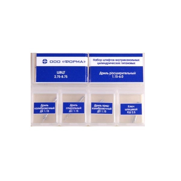 Набор штифтов внутриканальных цилиндрических титановых №1: ШВЦТ 2.75-8.75 - 6 шт, ДР 1.15-6.0, ДК 1.15, ДП 1.15, ДС 1.15, КШ 2.5 по 1 шт