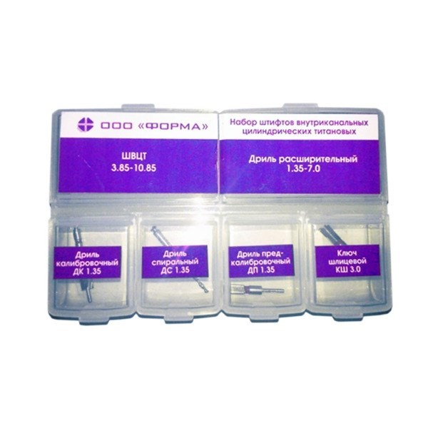 Набор внутриканальных цилиндрических титановых штифтов от российской компании «Форма» предназначается для укрепления реставраций на сильно разрушенных зубах.