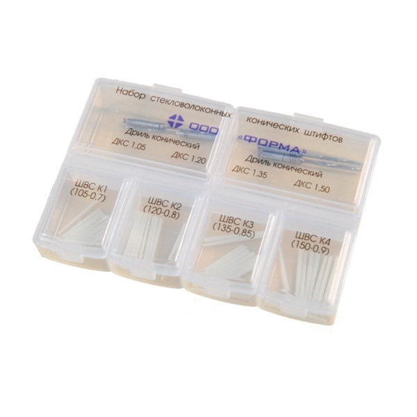 Набор стекловолоконных конических штифтов серии К (40 штифтов + 4 дриля): ШВС К1, К2, К3 по 10 шт, ДКС 1.05, ДКС 1.20, ДКС 1.35, ДКС 1.50 по 1 шт