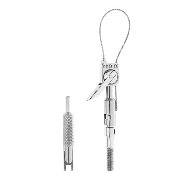 Петлевой адаптер к аппарату Коппа одинарный. Рабочая часть состоит из фиксационного элемента, зажима и петли. Один конец петли статично закреплен на вершине рабочей части адаптера, второй продевается через удаляемую конструкцию и закрепляется зажимным элементом в противоположной части вершины рабочей части адаптера. В центральной части адаптера в поперечной оси находится контактный пункт для захвата адаптера ключом для установки. Фиксируется в аппарат Коппа с помощью осевой резьбы в нижней части адаптера вращением по часовой стрелке с использованием ключа для установки. Мартенситная сталь DIN 1.4006, X10Cr13 (ГОСТ 12X13). Твердость по Роквеллу 40-45 RW.