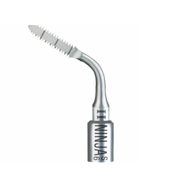 • Ninja, арт. F87545 — пила для ампутации и фрагментации корня. Эта обоюдоострая насадка для распиливания корней имеет лазерные отметки глубины через каждые 3 мм. Она особенно эффективна при выполнении гемисекции и ампутации корней. С помощью этой насадки можно также проводить распиливание ретенированных моляров во время удаления. Длина рабочей части: 9 мм