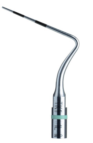 • TK2-1L, арт. F02162 — левосторонняя насадка, используется в средних и глубоких карманах с фуркациями (более 4 мм), (пародонт). Одна из основных пародонтологических насадок, позволяющих обрабатывать весь периметр шейки зубов и корней зубов в боковых секстантах зубных рядов (1, 3, 4, 6). Имеет круглое сечение малого радиуса, функциональный стержень имеет изгиб в левую сторону, адаптированный для обработки лингвальных поверхностей секстанта 3 и вестибулярных поверхностей секстанта 6. Во включенном состоянии может удалять небольшие конгломераты поддесневого камня. Имеет атравматичный закругленный кончик, на мощности 2-3 не разрушает периодонтальные прикрепления в области дна пародонтального кармана. Низкая амплитуда для лучшего тактильного контроля и атравматичного лечения