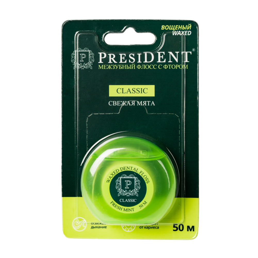 Нить межзубная вощеная PRESIDENT Classic Свежая мята с фтором 50 м