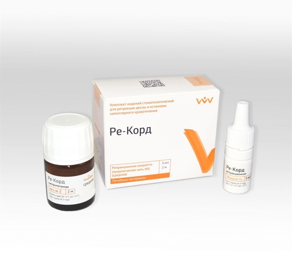 Набор «Ре-Корд» состоит из ретракционной жидкости (геля) для тампонирования и специально обработанных ретракционных нитей различной толщины:
