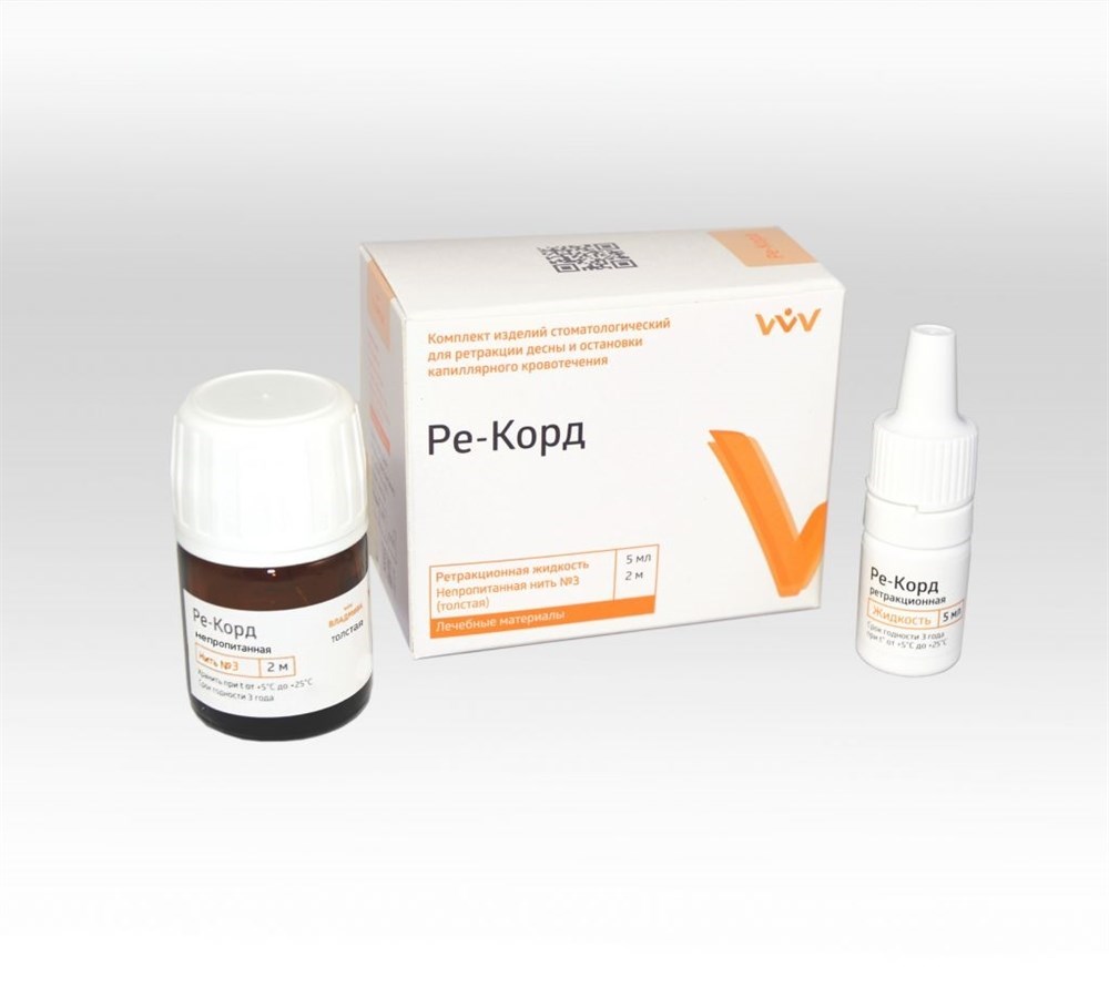 Набор «Ре-Корд» состоит из ретракционной жидкости (геля) для тампонирования и специально обработанных ретракционных нитей различной толщины: