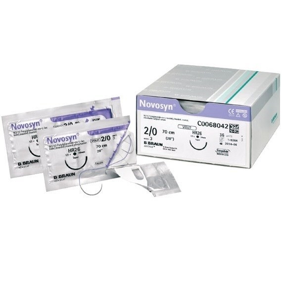 Новосин фиолетовый 5/0 (1) 70 см HR22, C0068028, (Bbraun) - универсальный синтетический плетеный шовный материал на основе полиглактида, состоящего из полимерных волокон 90/10 с покрытием. Нить имеет плетенную структуру, для лучшей визуализации окрашена в фиолетовый цвет. Novosyn рассасывается путем гидролиза и обеспечивает предсказуемое время поддержки раны.