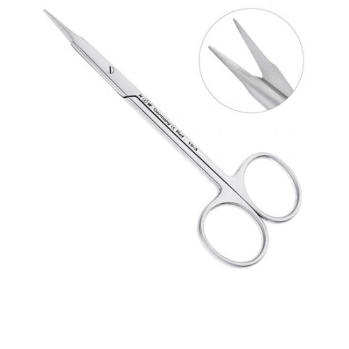 Ножницы HLW 19-3 Stevens прямые, 11.5 см используются для коррекции мягких тканей и шовного материала в ротовой полости. Производителем инструмента является немецкая компания HLW Dental Instruments. Прямая рабочая часть ножниц имеет симметричные заостренные режущие грани, истончающиеся к вершине. Такая конструкция рабочих поверхностей снижает риск повреждения инструмента и уменьшает нагрузку на руку при проведении операции. Одно из самозатачивающихся лезвий имеет зубчатую режущую поверхность, которая уменьшает шанс проскальзывания инструмента по плоскости мягких тканей. Ручки ножниц имеют стандартные кольцевые хваты для указательного и большого пальцев.