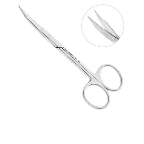Ножницы HLW 19-6 Goldmann-Fox хирургические изогнутые, 12.5 см с зубчатой режущей поверхностью на одном из лезвий используются для коррекции мягких тканей в ротовой полости. Производителем инструмента является немецкая компания HLW Dental Instruments. Рабочая часть ножниц изогнута по плоскости, что способствует введению инструмента в глубокорасположенные участки полости рта. Одно из самозатачивающихся лезвий имеет зубчатую режущую поверхность, предотвращающую скольжение инструмента по поверхности мягких тканей. Симметричные заостренные рабочие части ножниц истончаются к вершине. Такая конструкция лезвий облегчает проведение операции по коррекции мягких тканей в полости рта. Ножницы предназначены для использования как левой, так и правой рукой. Ручки инструмента имеют стандартные кольцевые хваты для указательного и большого пальцев.