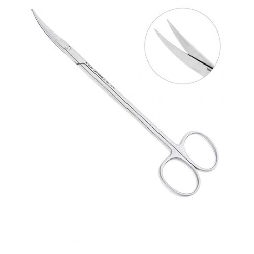 Ножницы HLW 19-15 изогнутые Kelly, 16,0 см, производства торговой марки HLW Dental Instruments с зубчатой поверхностью на одном из лезвий, изготовлены для разрезания мягких тканей в полости рта. Одно из самозатачивающихся лезвий имеет зубчатую режущую поверхность, предотвращающую скольжение инструмента по плоскости мягких тканей. Рабочая часть ножниц треугольной стандартной формы с острыми тонкими лезвиями, которые легко разрезают мягкие ткани в ротовой полости. Изгиб по плоскости в рабочей части инструмента способствует коррекции мягких тканей в глубоких и труднодоступных участках полости рта. Инструмент предназначен для использования как левой, так и правой рукой. Ручки инструмента имеют стандартные кольцевые хваты для указательного и большого пальцев. Оптимальное соотношение длины ручек к рабочей части ножниц существенно снижает нагрузку на кисть и способствует проведению операции.
