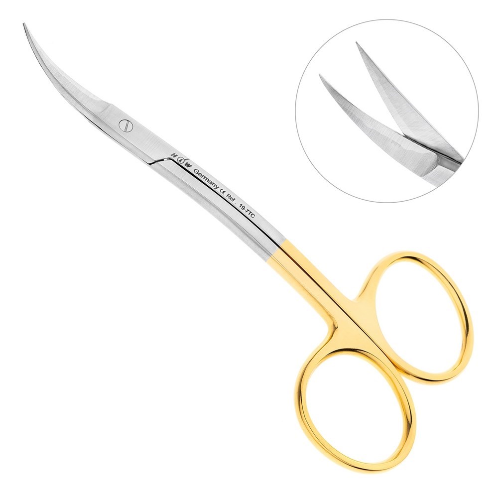 Лезвия ножниц имеют вставки из твердого сплава карбид-вольфрама, которые обеспечивают повышенную устойчивость к истиранию. Зубчатая режущая грань на одной из рабочих поверхностей препятствует скольжению инструмента по плоскости мягких тканей, что упрощает проведение полостных операций. Рабочая часть ножниц треугольной стандартной формы с острым тонким лезвием, которое без затруднений разрезает мягкие ткани в ротовой полости.