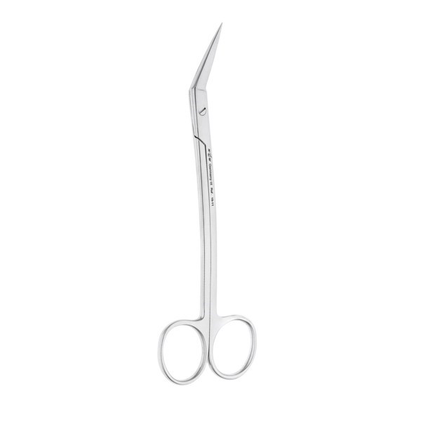 Ножницы угловые для мягких тканей конструкции ГОЛДМАНА-ФОКСА (по автору). Могут использоваться в хирургической стоматологии и парадонтологии для работы с мягкими тканями челюстно-лицевой области и для работы с шовным материалом. Длинна инструмента не более 16 см. Серейторная заточка режущей поверхности препятствует эффекту размозжения тканей и уменьшает шанс выскальзывания, имеет самозатачивающийся эффект.