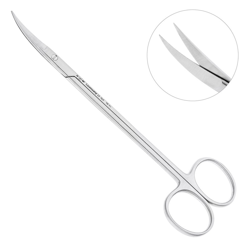 Хирургические ножницы Kelly торговой марки HLW Dental Instruments с зубчатой поверхностью на одном из лезвий изготовлены для разрезания мягких тканей в полости рта.