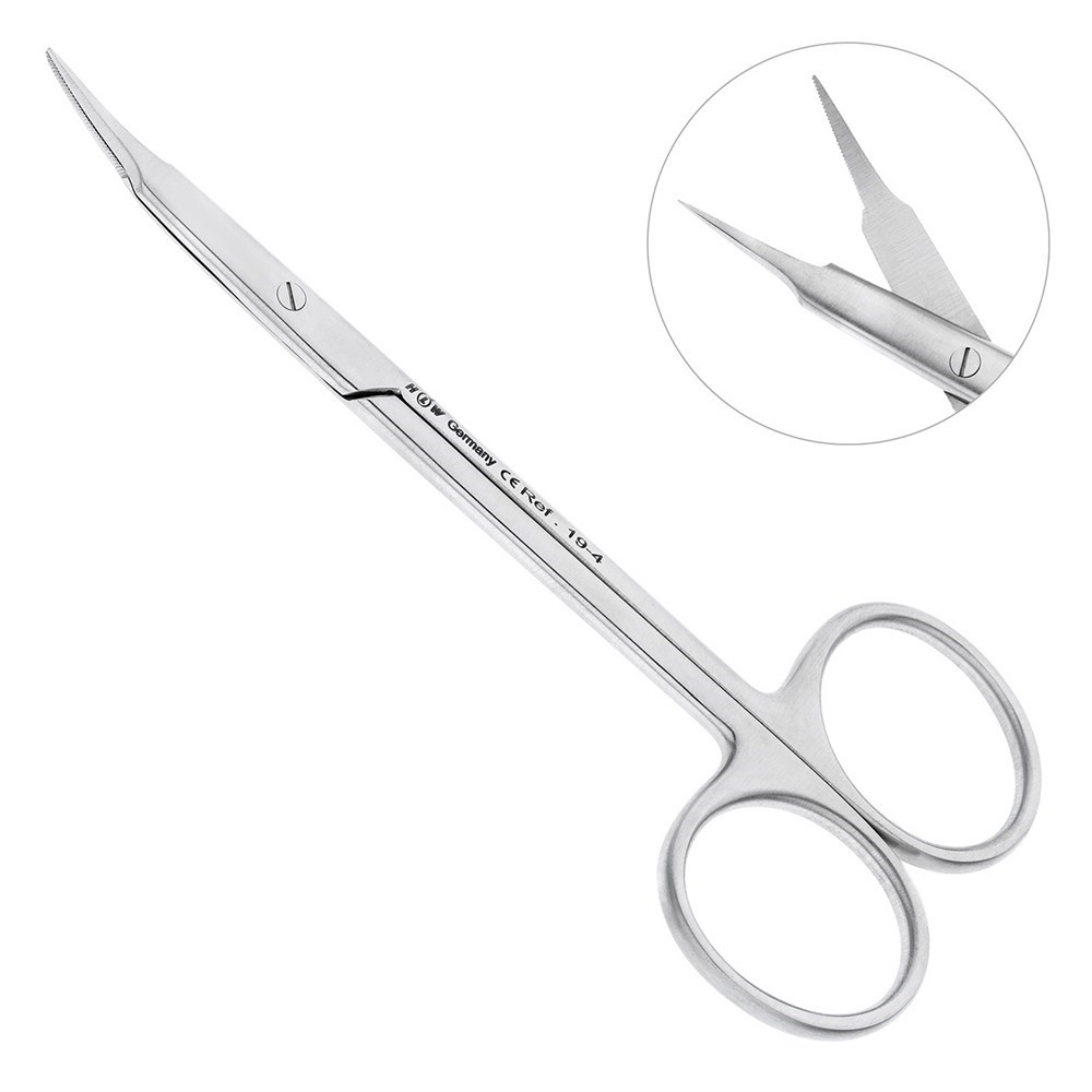 Хирургические ножницы Stevens с зубчатой режущей поверхностью на одном из лезвий используются для коррекции мягких тканей в ротовой полости. Производителем инструмента является немецкая компания HLW Dental Instruments.