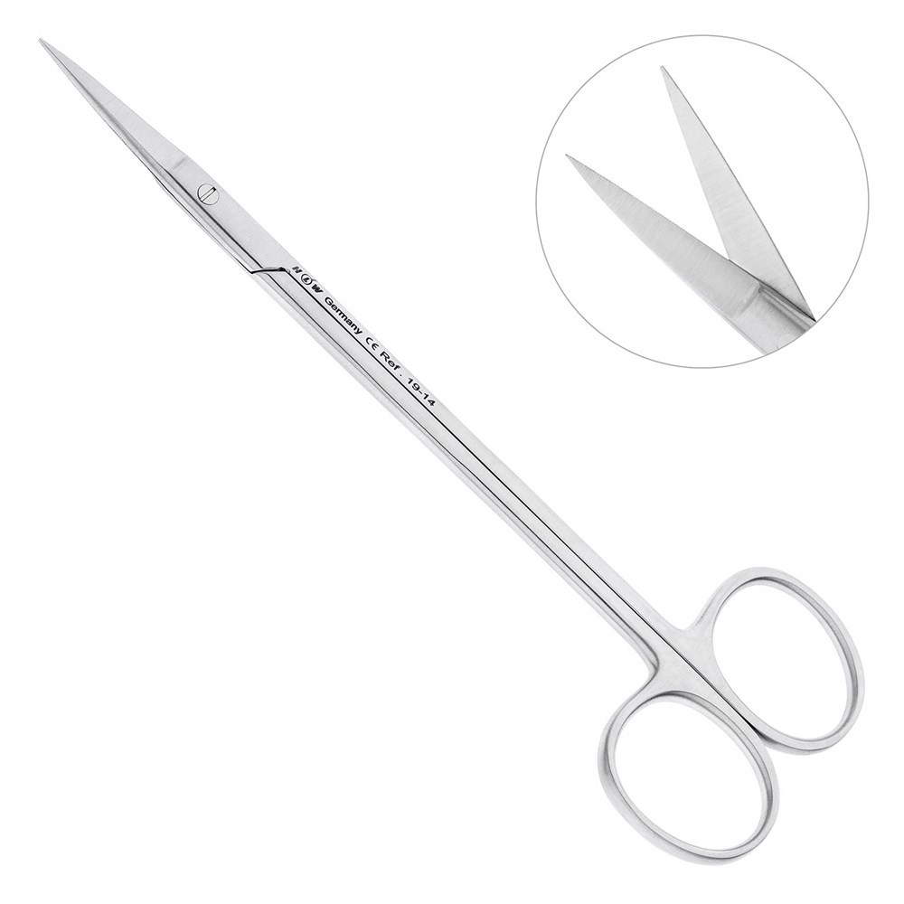 Зубчатая режущая грань на одной из рабочих поверхностей препятствует скольжению инструмента по плоскости мягких тканей, что упрощает проведение полостных операций. Прямая рабочая часть ножниц треугольной стандартной формы с острым тонким лезвием, которое без затруднений разрезает мягкие ткани и шовные материалы в ротовой полости.