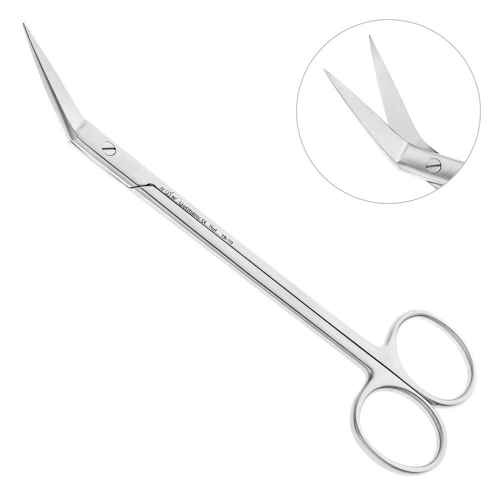 Для работы с мягкими тканями челюстно-лицевой области и шовным материалом используются хирургические ножницы Locklin с зубчатой режущей поверхностью на одном из лезвий. Производителем инструмента является компания HLW Dental Instruments.