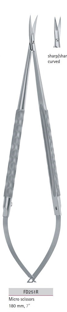 Ножницы микрохирургические, изогнутые, длина 180 мм, FD251R, B.Braun (Aesculap, Германия) состоят из лезвия, шарнирного замка, рукоятки и возвратно-пружинящего устройства. Инструмент имеет небольшую длину лезвий по сравнению с длиной рукояток, неровную наружную поверхность рукояток для удобства фиксации в руке и удлиненную прорезь на рукоятках для кончиков пальцев. Микрохирургические ножницы предназначены для проведения различных манипуляций в пародонтологии, нейро- и сосудистой хирургии, а также в частных случаях офтальмологии. Инструмент обеспечивает максимальную точность рассечения и сводит к минимуму риски повреждения.