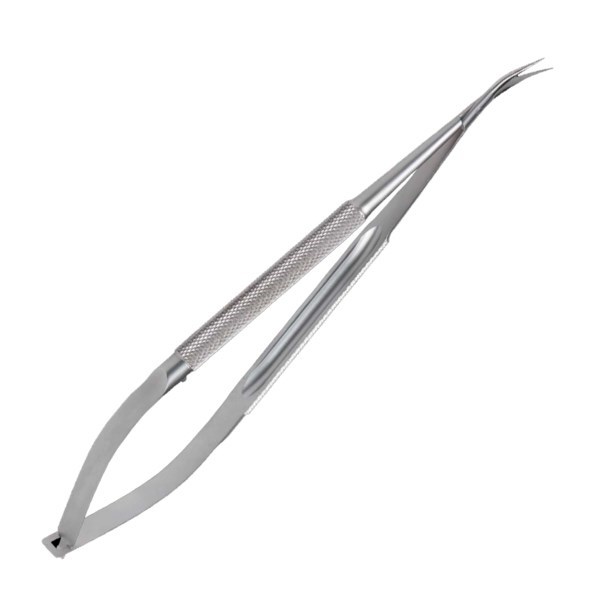 Ножницы микрохирургические, плавноизогнутые, остроконечные, лезвия изогнуты по радиусу вверх, длина 165 мм