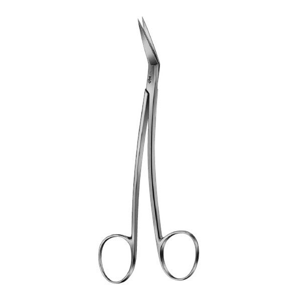 Ножницы препаровальные, по LOCKLIN, угловые, длина 155 мм, DO219R, B.Braun (Aesculap, Германия) изготовлены из нержавеющей стали и имеют рукоятку с лопастями, расположенными под углом вверх. Надежная конструкция и острота режущего края, сохраняемая в течение всего срока эксплуатации, позволяет использовать ножницы длительное время. Инструмент предназначен для рассечения тканей, анатомических структур, лигатур и иных целей.