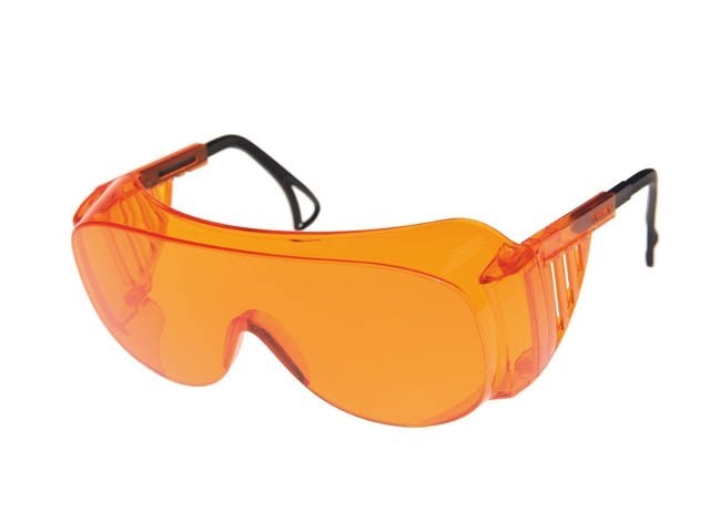 Очки с прозрачным защитным стеклом оранжевого цвета из оптически прозрачного материала Plexiglas.
