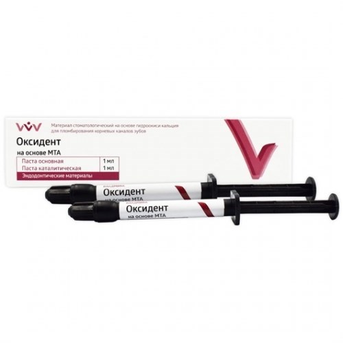 Материал стоматологический «Оксидент» на основе МТА, содержащий оксиды кальция, кремния, алюминия и дисалицилатную смолу «Оксидент» на основе МТА) предназначен для пломбирования корневых каналов зубов при лечении пульпита или апикального периодонтита. Применяется в сочетании с гуттаперчевыми штифтами (одноштифтовой метод и все виды техники конденсации).