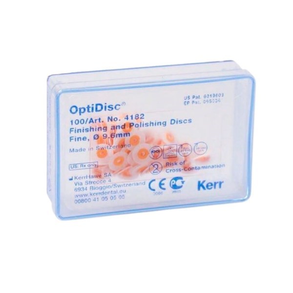 Диски для полировки OptiDisc тонкие. Диаметр 9,6 мм, зернистость 20 мк, упаковка 100 шт. Прозрачный обеспечивает превосходный обзор рабочего пространства. Использование меньшего, чем в других системах, количества шагов позволяет быстрее достичь зеркального блеска поверхности. Абразивную сторону легко определить с помощью зеленого кода. Устойчивая фиксация диска на держателе позволяет работать точнее. Запантетованная система фиксации и специальное покрытие держателя защищают от царапин и изменения цвета зуба и поверхности пломбы.