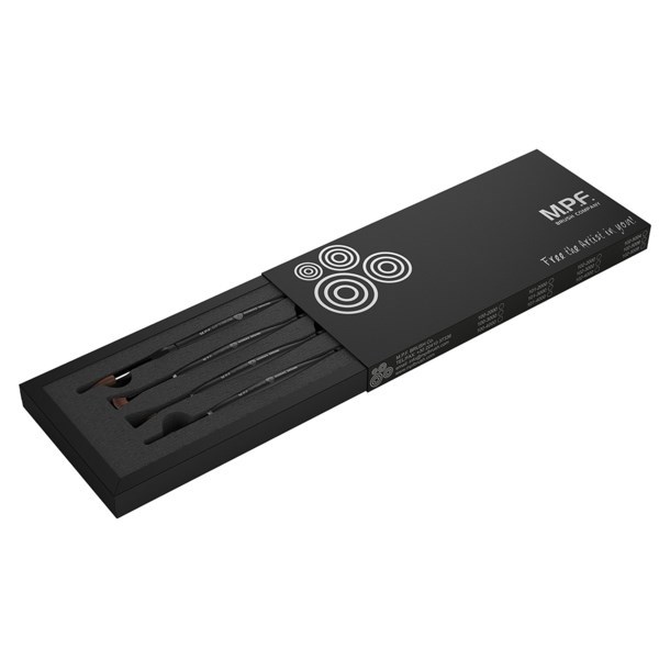 Фирма M.P.F.Brush предлагает уникальную возможность зубному технику приобрести набор из универсальной алюминиевой рукоятки с пружинным механизмом и трёх наконечников разных размеров. Экономя при этом достигает более 30%. Насадки могут быть заменены в считанные секунды. По мере изнашивания насадки могут заказываться отдельно. Все наборы поставляются в элегантном фирменном футляре. В набор входят 4 шт. кисти