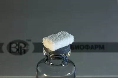 Остекондуктивный и остеоиндуктивный пористый биоматериал для заполнения объема костного дефекта или полости. Избирательное связывание костными сГАГ тромбоцитов крови (ТК) позволяет создать химически фиксированную, стабильную концентрацию ТК на материале, немедленно запуская каскад реакций формирования костного матрикса, без дополнительных манипуляций с кровью пациента. Материал характеризуется высокой биосовместимостью с костной тканью. Низкая антигенность, не иммуногенен.