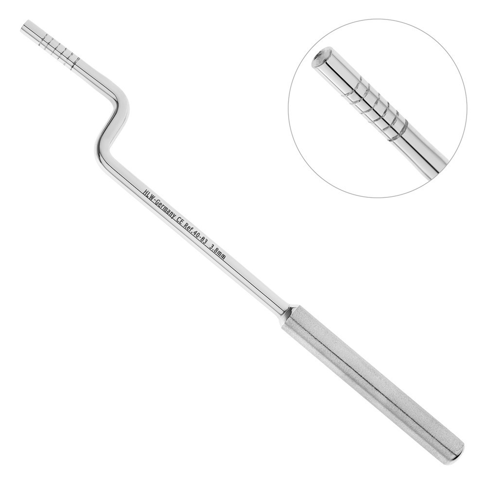 Для конденсации мягкой костной ткани в месте внедрения имплантата и закрытого синус-лифтинга применяется остеотом с диаметром рабочей части 3,8 мм. Стоматологический инструмент изготовлен компанией HLW Dental Instruments.