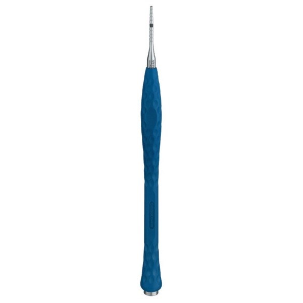 Остеотом, ERGOPLANT, 2,8/3,5 мм, DX532R, B.Braun (Aesculap, Германия) имеет удобную эргономичную ручку синего цвета. Рабочая часть инструмента изготовлена из нержавеющей стали, имеет масштабирование с шагом 2 мм, а также нестираемую лазерную маркировку размера и обозначения зоны безопасности.