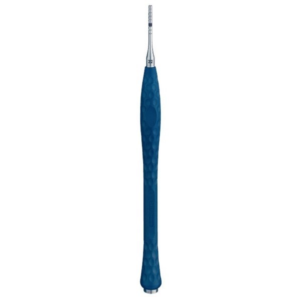 Остеотом, ERGOPLANT, прямой, 2,8 мм, DX571R, B.Braun (Aesculap, Германия) имеет удобную эргономичную ручку синего цвета. Рабочая часть инструмента изготовлена из нержавеющей стали, на ней имеется нестираемая лазерная маркировка размера, шкалы с шагом в 2 мм, а также обозначена зона безопасности. Данный остеотом применяется для поднятия гайморовой пазухи.