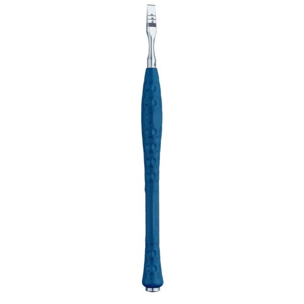 Долото, ERGOPLANT, прямой, ширина 6 мм, длина 160 мм, DX512R, B.Braun (Aesculap, Германия) имеет удобную эргономичную ручку синего цвета. Рабочая часть инструмента изготовлена из нержавеющей стали, для обозначения зоны безопасности нанесена нестираемая лазерная маркировка, а также шкала с шагом 2 мм.