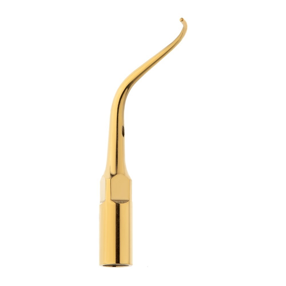 Пародонтологическая насадка P2RT используется для очистки области фуркационных дефектов от зубных отложений из очень узких пространств между корнями многокорневого зуба. Имеет изогнутую в правую сторону форму. Специальное напыление нитрид-титана на поверхности насадки не только создает красивый вид изделия, но и повышает его износостойкость.