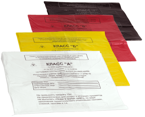 Пакеты полиэтиленовые одноразовые для сбора, хранения и утилизации медицинских отходов. Размер 500х600мм толщиной 12 мкм. Информационное окно напечатано по центру пакета и содержит следующую информацию: класс отходов, название ЛПУ, ФИО ответственного лица за сбор отходов, дата сбора отходов. На пакет наносится информация о производителе, № ТУ и № РУ производителя. Цвет пакета соответствует цветовой кодировке отходов класс Б (цвет - желтый). Поставляется без стяжки.