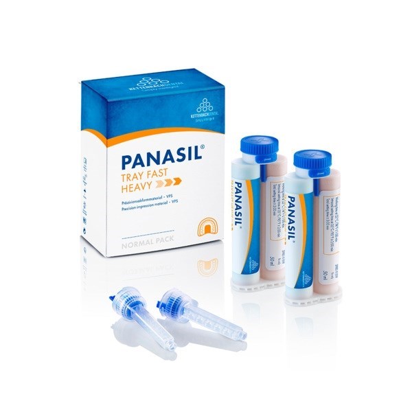 Panasil tray Fast Heavy - вязкотекучий, устойчивый материал на основе А-силикона в больших картриджах 5:1 для точных оттисков. Основными особенностями материала является короткое время пребывания во рту и высокая конечная твердость (Shore-A 62). Рекомендуется применять для корректурного двухэтапного оттиска, а также в технике двойного смешивания.