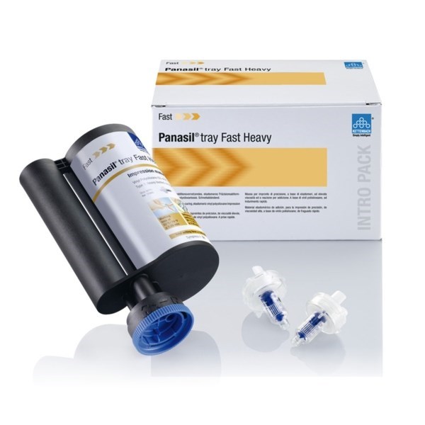 Основными особенностями материала Panasil tray Fast Heavy являются короткое время пребывания во рту и высокая конечная твердость (Shore-A 62). Рекомендуется применять для корректурного двухэтапного оттиска, а также в технике двойного смешивания.