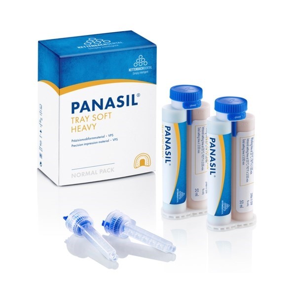 Panasil tray Soft Heavy - вязкотекучий, устойчивый материал на основе А-силикона в больших картриджах 5:1 для точных оттисков. Основной особенностью материала является пониженная конечная твердость (Shore-A 55) для более легкого извлечения из ротовой полости. Рекомендуется применять для корректурного двухэтапного оттиска, а также в технике двойного смешивания.