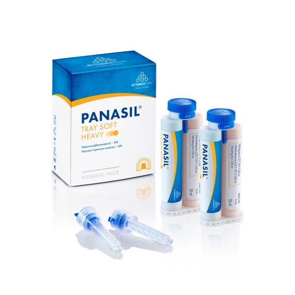 Panasil tray Soft Heavy - вязкотекучий, устойчивый материал на основе А-силикона в больших картриджах 5:1 для точных оттисков. Основной особенностью материала является пониженная конечная твердость (Shore-A 55) для более легкого извлечения из ротовой полости. Рекомендуется применять для корректурного двухэтапного оттиска, а также в технике двойного смешивания.